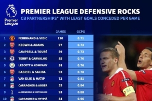 全文摘要:《转会市场网》统计了英超历史场均丢球最少的20组中后卫搭档(至少合作50场)。曼联的费迪南德与维迪奇搭档120场,以场均仅丢0.71球高居榜首。阿森纳基翁与亚当斯、切尔西特里与卡瓦略分列二、三位。该榜单展现了英超历史上防守最稳固的中卫组合。