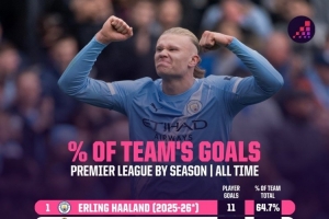 全文摘要:Opta统计显示,本赛季哈兰德为曼城打入11球,占全队总进球的64.7%,创下英超单赛季球员进球占比新高。这一数据超越了此前保持纪录的詹姆斯·比蒂(02-03赛季,53.5%),彰显了哈兰德在球队进攻端的绝对统治力。