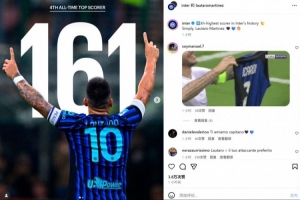 全文摘要:国米2-0胜拉齐奥,劳塔罗首发出场建功。此球使他以161球追平马佐拉,并列队史射手榜第四位。他发文晒照庆祝,并配以表情符号。