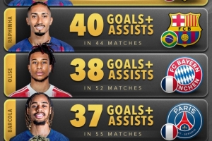 2025年边锋进球排行榜:亚马尔以44球拔得头筹,拉菲尼亚40球紧随其后。