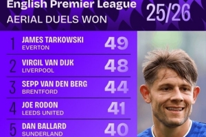 全文摘要:英超11轮后,埃弗顿后卫塔科夫斯基以49次空中成功对抗力压利物浦的范戴克(48次),暂居榜首。布伦特福德的范登贝尔赫以44次位列第三,利兹联的罗登、桑德兰的巴拉德和曼联的德里赫特均以40次并列第四。