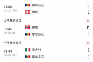 挪威虽两战皆负垫底,却以15球大胜摩尔多瓦,反观意大利仅进4球。