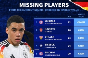 体育资讯11月15日讯 德转列德国落选本次国家队名单的球员身价排行,穆西亚拉1.4亿欧居首,哈弗茨6000万欧第二,斯蒂勒4500万欧第三。