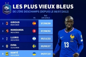 全文摘要:在世预赛中,坎特助法国4-0大胜乌克兰。德转列出德尚执教法国队以来年龄最大出场球员排名:吉鲁(37岁9个月)居首,洛里、曼达纳紧随其后,坎特以34岁7个月位列第五。