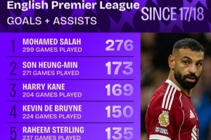 全文摘要:根据数据机构squakwa统计,自17-18赛季以来,英超直接参与进球榜萨拉赫以276球断崖领跑。孙兴慜(173球)和凯恩(169球)分列二、三位,哈兰德以108场116球的高效率位居第九。