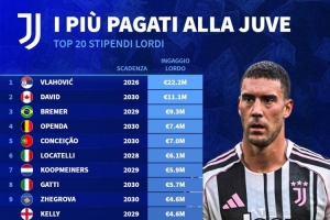 全文摘要:根据德国转会市场数据,尤文球员税前年薪榜单出炉。弗拉霍维奇以2220万欧高居榜首,戴维以1110万欧位列第二。布雷默(930万欧)、奥蓬达(740万欧)和孔塞桑(700万欧)分列三至五位,其余球员年薪从610万欧至280万欧不等。