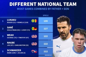 全文摘要:德国转会市场统计了足坛父子代表不同国家队的出场次数榜单。布冯之子路易斯在捷克U19表现优异,有望入选成年队,父子合计出场次数待定。目前,卢卡库父子以135场居首,萨内(127场)、维阿与纳比(122场)紧随其后。