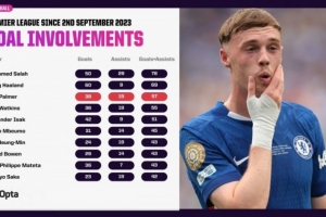 切尔西球员帕尔默自英超首秀以来,已参与57球,同期数据仅次于萨拉赫与哈兰德。