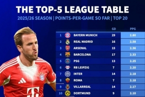 全文摘要:五大联赛场均拿分榜出炉,拜仁慕尼黑以2.80分领跑,并拥有最高的+29净胜球。皇家马德里以2.58分位居次席,阿森纳、巴塞罗那和巴黎圣日耳曼分列三至五名。曼城、勒沃库森等18支球队场均拿分均达2.00分。