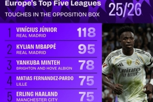 全文摘要:五大联赛球员禁区内触球榜出炉,皇马前锋维尼修斯以118次居首,力压队友姆巴佩(95次)。哈兰德与费尔南德斯并列第五(75次),拉什福德、萨拉赫等知名球员也跻身前十。