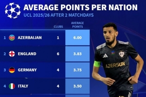 全文摘要:欧冠第二轮后,德国转会市场统计了各国球队平均积分。阿塞拜疆(1队)以6分高居榜首,英格兰(6队)3.83分次之,德国(4队)3.75分紧随其后。意大利、法国、比利时、土耳其分列其后,西班牙(5队)2.6分垫底。