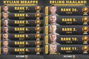 全文摘要:外媒Score90制作了姆巴佩与哈兰德的金球奖历年排名对比。作为当今足坛最炙手可热的两名射手,两人至今均未获奖。数据显示,哈兰德近年排名持续攀升(2023年第二),而姆巴佩虽有起伏(2023年第三)。两人谁将率先夺得金球奖引人关注。