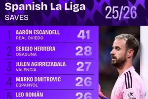 全文摘要:Squawka统计显示,西甲本赛季扑救次数排行榜出炉。皇家奥维耶多门将埃斯坎德尔以41次扑救高居榜首。奥萨苏纳的塞尔吉奥-埃雷拉(28次)与瓦伦西亚的阿吉雷萨巴拉(27次)分列二、三位,其他门将的扑救次数则在22至26次之间。