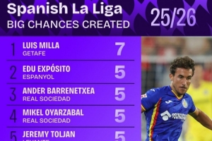全文摘要:Squawka统计了本赛季西甲创造机会次数排行,赫塔费的路易斯-米拉以7次居首。拉菲尼亚与居勒尔均创造4次机会,并列第六。