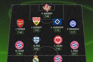 全文摘要:WhoScored评选出本赛季五大联赛最佳阵容。门将为奥德罗。后卫线由廷伯、沙博特、武什科维奇和迪马尔科组成。中场包括奥利塞、尼科-帕斯、乌尊和迪亚斯。锋线上则由姆巴佩与凯恩领衔。