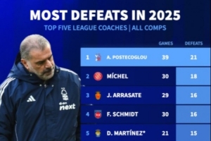 全文摘要:诺丁汉森林主帅波斯特科格鲁是五大联赛本赛季输球最多的教练,达21场。他在热刺和森林的执教均表现不佳。在五大联赛主帅输球场次榜上,他高居榜首,曼联主帅阿莫林以15场输球场次位列第四。
