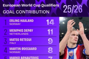 全文摘要:根据Squawka统计,在本届欧洲世预赛球员参与进球榜上,哈兰德以14球(进球+助攻)高居榜首,德佩以11球位列第二。雷特吉、厄德高等球员也榜上有名。
