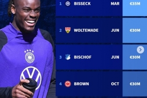 全文摘要:德国转会市场盘点,2025年德国队将迎来5名新秀首秀,包括比塞克、沃尔特马德等。身价方面,比塞克(3500万欧)最高,沃尔特马德、比朔夫、布朗均为3000万欧,柯林斯为1800万欧,他们分属国米、斯图加特等俱乐部。