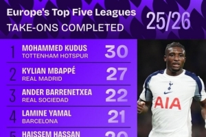 全文摘要:热刺前锋库杜斯以30次成功过人领跑本赛季欧洲五大联赛过人榜,皇马的姆巴佩以27次位居次席。榜单中,巴萨新星亚马尔位列第四,皇马的维尼修斯、曼城的多库等知名球员也榜上有名。
