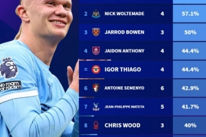 体育资讯10月19日讯 在本轮英超曼城2-0击败埃弗顿,哈兰德梅开二度,本赛季英超打进11球。德转也盘点了英超单一球员进球占全队百分比榜单,其中哈兰德居首,具体如下: