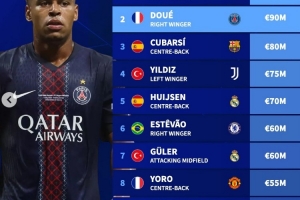 足坛U20球员身价最新排名:亚马尔以2亿欧元身价位列第一,杜埃排名第二,库巴西位居第三。
