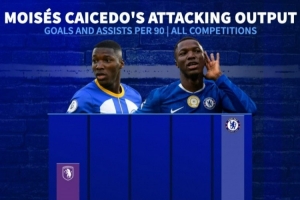 凯塞多英超生涯每90分钟参与进球数实现逐年增长,展现持续进化态势。